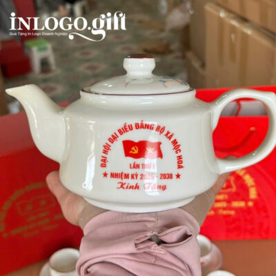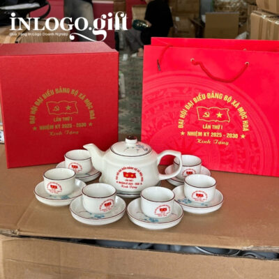 Quà tặng InLoGo đã thiết kế bộ ấm chén này dành riêng cho Đại hội Đại biểu Đảng bộ xã Mộc Hòa lần thứ I – Nhiệm kỳ 2025-2030, giúp lưu giữ dấu ấn sự kiện và tạo nên hình ảnh trang trọng trong lòng khách mời, đại biểu.