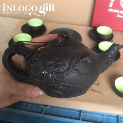 Ấm trà in logo và hoạ tiết hoa sen đắp nổi ấn tượng
