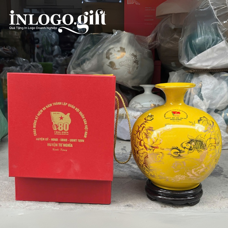 Bình hút lộc in logo màu vàng họa tiết hoa sen và cá chép không chỉ là món quà phong thủy cao cấp mà còn là công cụ truyền thông thương hiệu tinh tế. Với thiết kế mang đậm ý nghĩa văn hóa và khả năng cá nhân hóa thương hiệu, sản phẩm là lựa chọn lý tưởng cho doanh nghiệp trong mọi dịp tặng quan trọng.