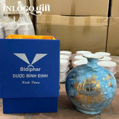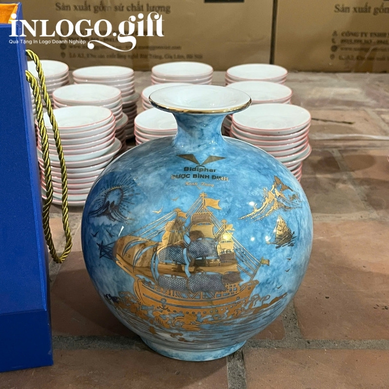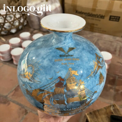 Bình hút lộc in logo màu xanh loang hoạ tiết thuận buồm xuôi gió vàng kim là vật phẩm trang trí nội thất sang trọng, nổi bật với lớp men màu độc đáo làm nền cho các đường nét vẽ vàng rực rỡ. Mang biểu tượng của sự hanh thông và tài lộc, sản phẩm này được Quà tặng INLOGO giới thiệu như một giải pháp quà tặng ý nghĩa để gửi lời chúc thành công đến đối tác, khách hàng dịp đặc biệt. Khi in ấn logo lên thân bình, doanh nghiệp không chỉ trao đi may mắn mà còn khẳng định uy tín và duy trì hình ảnh thương hiệu bền vững trong tâm trí người nhận.