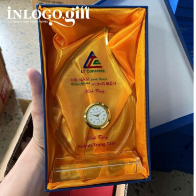 Tại InLoGoGift, được đặt trong hộp xi lót lụa sang trọng, đồng hồ pha lê không chỉ là vật dụng trang trí bàn làm việc mà còn truyền tải thông điệp “One Team One Dream Vững Bền” cho LT Concrete.