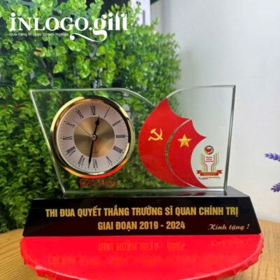 Với chất liệu pha lê trong suốt kết hợp cùng kỹ thuật in lưới sắc nét, sản phẩm mang lại sự đẳng cấp, bền đẹp theo thời gian. Đặc biệt, đồng hồ để bàn quà tặng được cá nhân hóa với logo Thi đua quyết thắng Trường Sĩ quan chính trị giai đoạn 2019-2024, thể hiện niềm tự hào và giá trị tinh thần sâu sắc. Đây là giải pháp quà tặng mà InLoGo.Gift khuyến nghị dành tặng đại biểu, lãnh đạo.