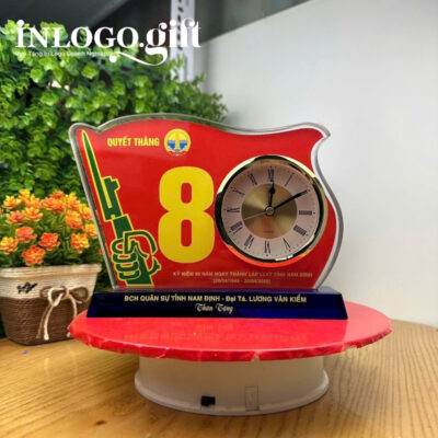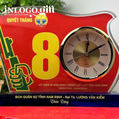 Với gam màu đỏ tượng trưng cho sự may mắn và thành công, sản phẩm trở nên đặc biệt khi được InLoGo in logo kỷ niệm 80 năm ngày thành lập LLVT Tỉnh Nam Định. Đồng hồ để bàn in logo là món quà không chỉ để xem giờ mà còn mang giá trị trưng bày và lưu giữ dấu ấn ý nghĩa, thích hợp dành tặng cho đại biểu, lãnh đạo, đối tác trong các dịp kỷ niệm và đại hội quan trọng.