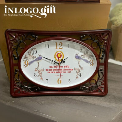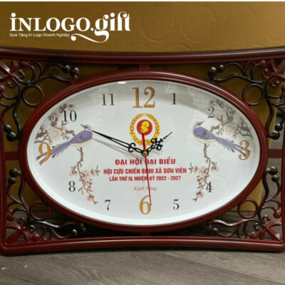 In logo lên đồng hồ treo tường quà tặng Đại hội số in ĐHT-18 là sự kết hợp hài hòa giữa chất liệu nhựa cao cấp, viền gỗ sang trọng và kỹ thuật in offset sắc nét.
