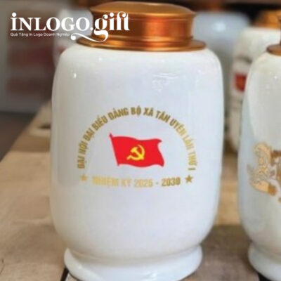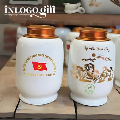 Với chất liệu gốm sứ Bát Tràng cao cấp, màu trắng sang trọng, kỹ thuật in decal bền đẹp cùng hộp xi lót lụa trang nhã, hũ đựng trà in logo làm quà tặng trở thành lựa chọn lý tưởng trong quà tặng doanh nghiệp.