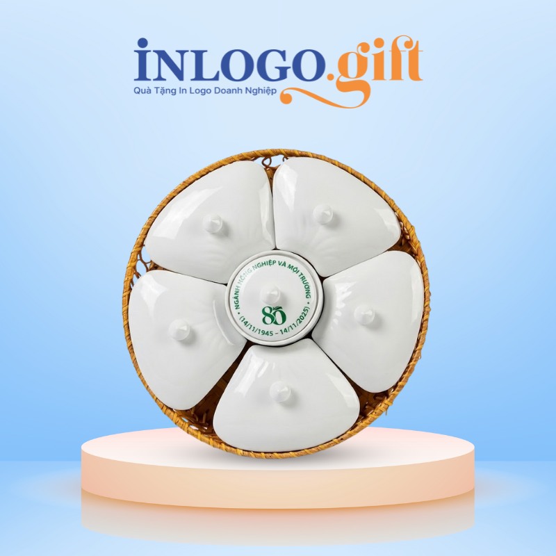 - Công nghệ in decal chuyên nghiệp: Quà tặng INLOGO áp dụng kỹ thuật in decal hiện đại, cho phép logo và thông điệp của doanh nghiệp được thể hiện sắc nét, bền màu trên nắp hũ trung tâm, đảm bảo hiệu quả nhận diện thương hiệu lâu dài.