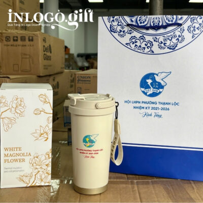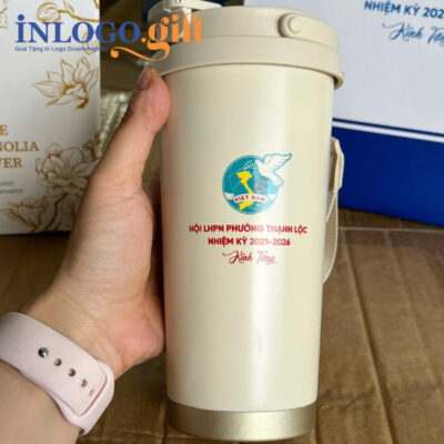 Với chất liệu inox bền đẹp, thiết kế màu kem sang trọng và hộp xi lót lụa, ly giữ nhiệt in logo làm quà tặng mang đến hình ảnh chuyên nghiệp và đẳng cấp. Logo được in sắc nét bằng kỹ thuật in lưới, thể hiện dấu ấn cá nhân hóa riêng biệt của Hội liên hiệp Phụ nữ phường Thạnh Lộc – Nhiệm kỳ 2021-2026.